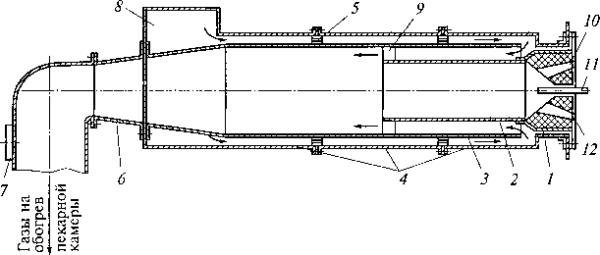 Газ сгорает в жароупорном цилиндре 2, внутренняя поверхность которого футеруется кольцами из жароупорной массы. Рециркулирующие газы поступают через патрубок 8 и затем, двигаясь между цилиндрами 3 и 4, охлаждают первый, затем огибают