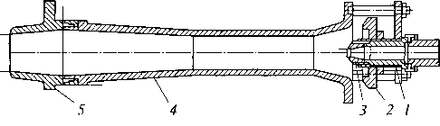 Топочное устройство печи с рециркуляционным обогревом (рис. 3.23) состоит из жароупорного цилиндра 2, соединенного одной стороной с металлическим конусом 7, другой — четырьмя пластинками 9 с цилиндром 3. Внешняя поверхность камеры собрана из трех металлических цилиндров; между цилиндрами 3 и 4 установлены дистанционные кольца 5. В цилиндре 4 имеется патрубок для подвода рециркулирующего газа. Открытый левый торец камеры сгорания соединен с патрубком 6, отводящим газ в каналы обогрева.