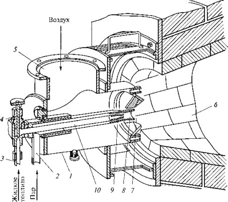 Форсунка с универсальным распылителем (рис. 3.25) состоит из металлического корпуса 7, внутри которого горизонтально расположен ствол форсунки 10, собранный из двух трубок (одна в другой), наконечника 9, распыливающего конуса 8 и сопла 7. В кладке стены топки из огнеупорного кирпича выкладывается зажигательный конус 6. Корпус форсунки крепится болтами к кладке стены топки.