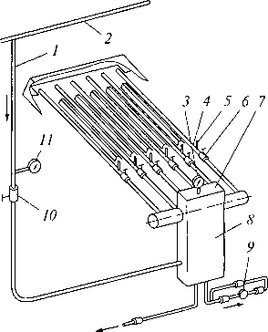 Пар подводят (рис. 3.27) от паропроводов 7 и 2, оснащенных вентилем 10 и манометром 77, по перфорированным трубам 4 через боковую поверхность пекарной камеры.